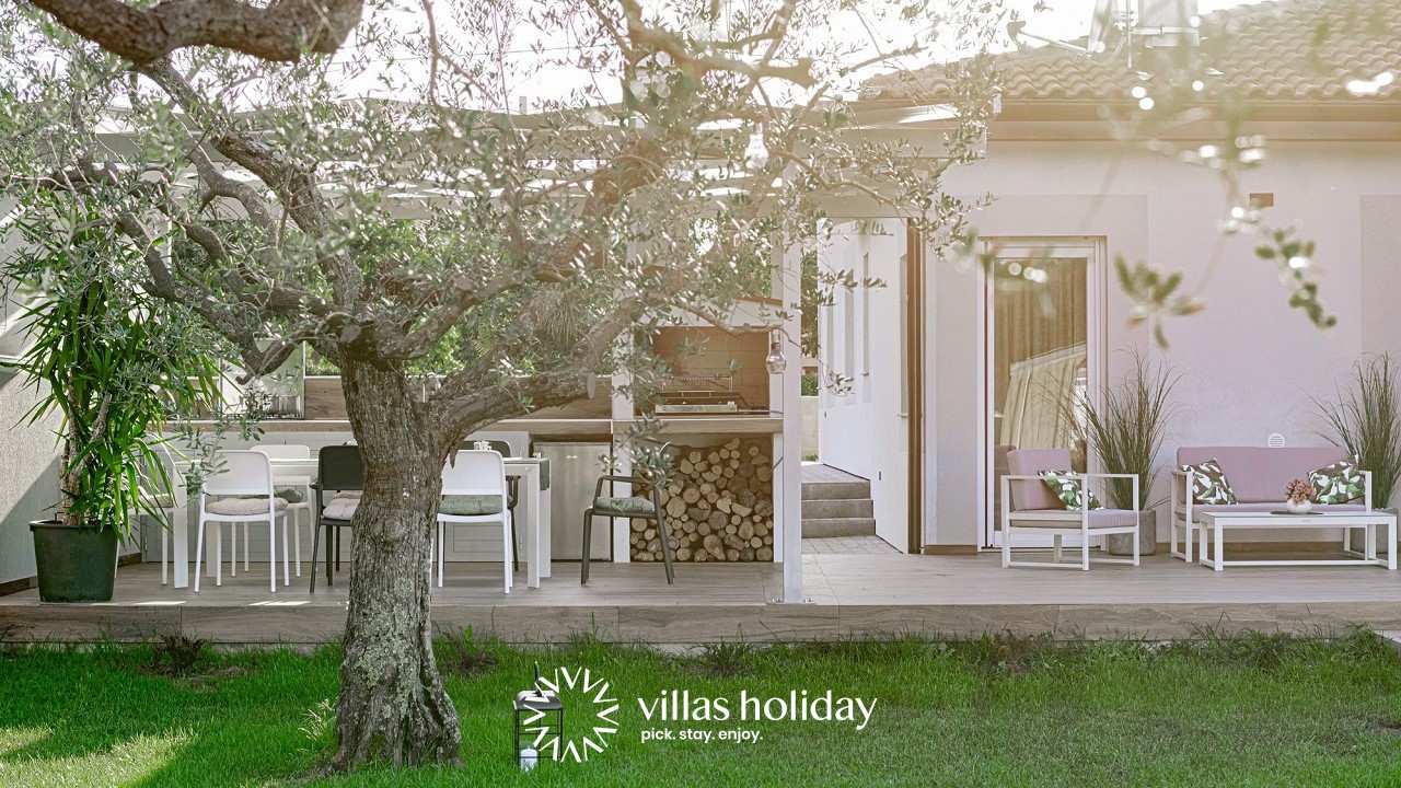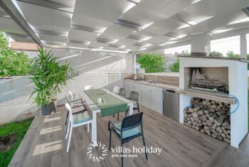 Der gut gepflegte Außenbereich verspricht die wahre Entspannung und eine großartige Zeit. Er umfasst eine Küche mit Grill und einer Esszimmergarnitur mit einem Stoffdach, wo Sie eine herrliche Mahlzeit direkt draußen im Freien genießen können. Es gibt auch ein Jacuzzi mit Sonnenschutz und eine Dusche in der Nähe des Swimmingpools. Also, während Sie auf einer Liege ein Sonnenbad nehmen, können die Kinder ganz unbesorgt auf der Wiese spielen oder im Pool plantschen.