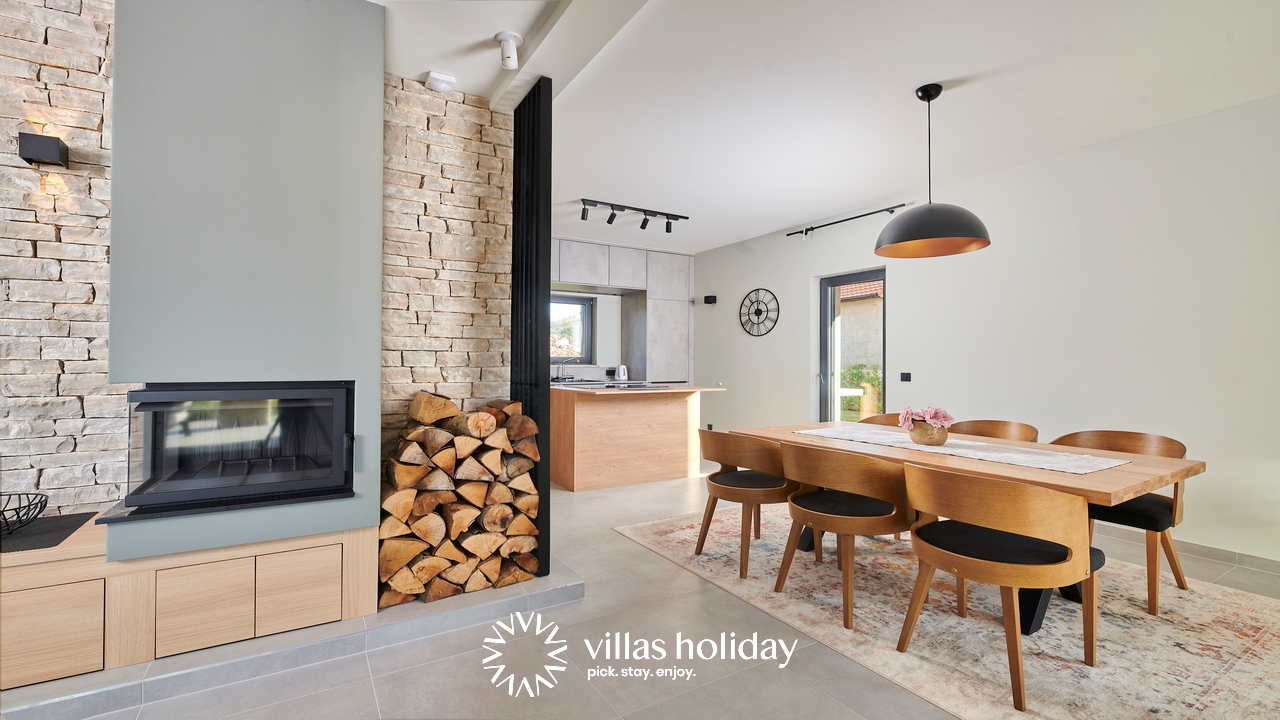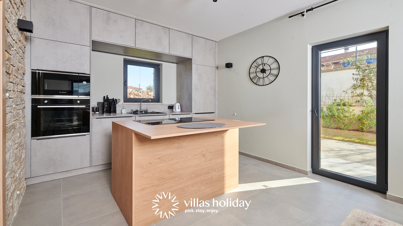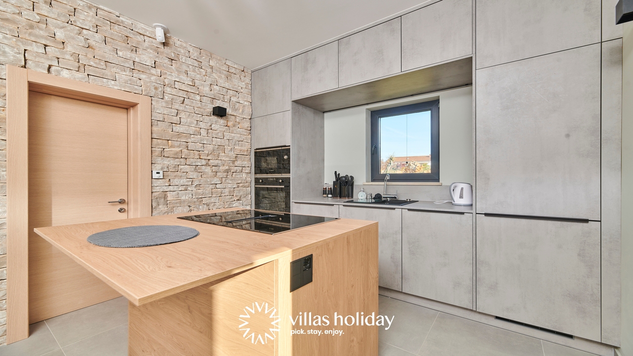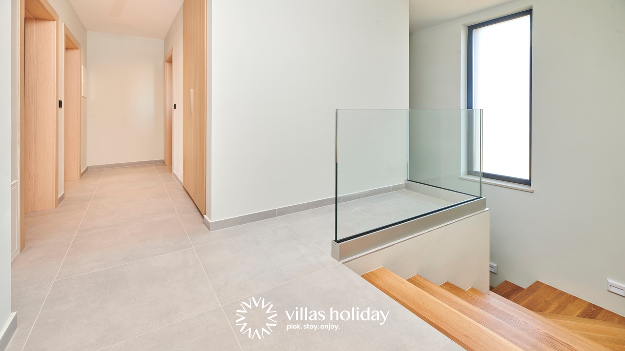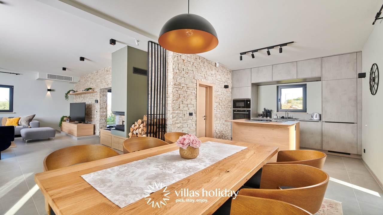 The charming 3-bedroom villa spreads over two floors providing you with the best of modern design and a cozy home feeling, creating the ideal atmosphere for your holiday. The main floor of the house is an open concept that gives you an unobstructed passage from the kitchen all the way to the outdoor area with a swimming pool. A modern kitchen is at your disposal to prepare delicious meals that can be served on the spacious dining table. And the living room, always ready to host you for an afternoon rest, is just a step away.