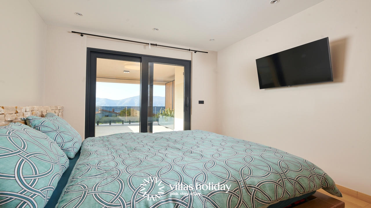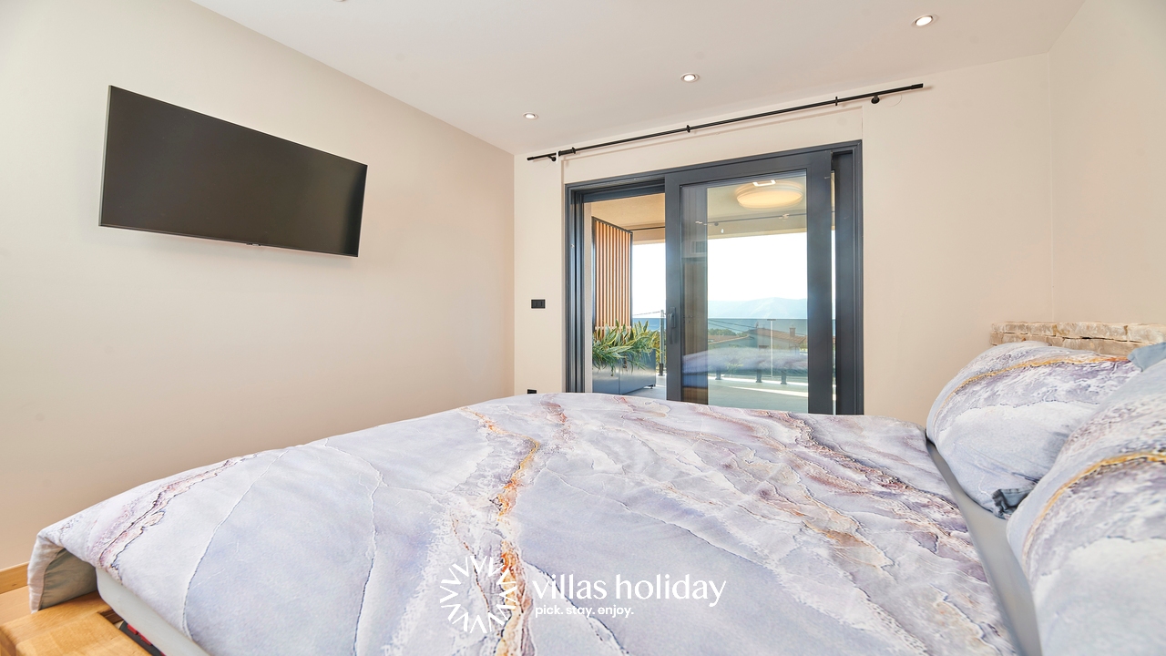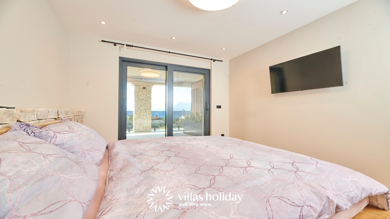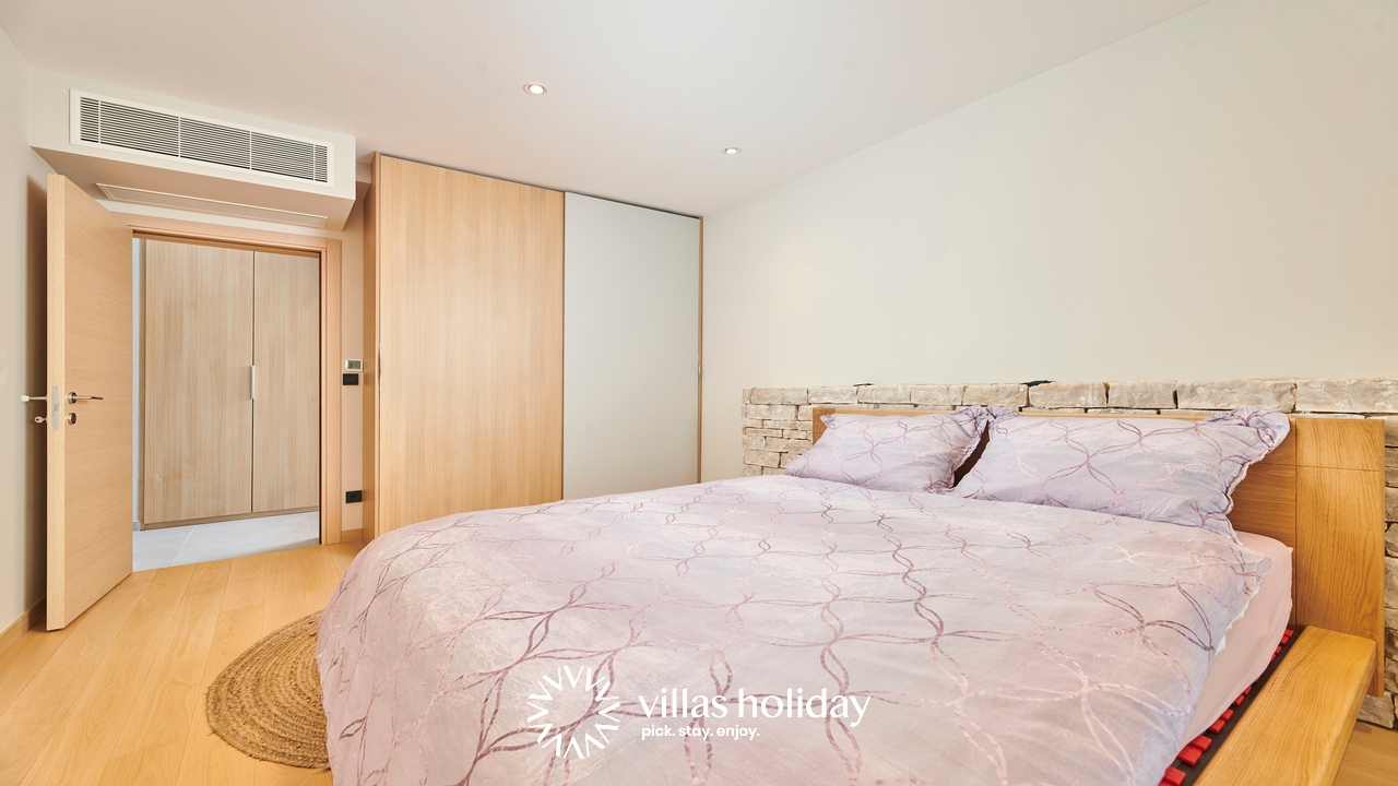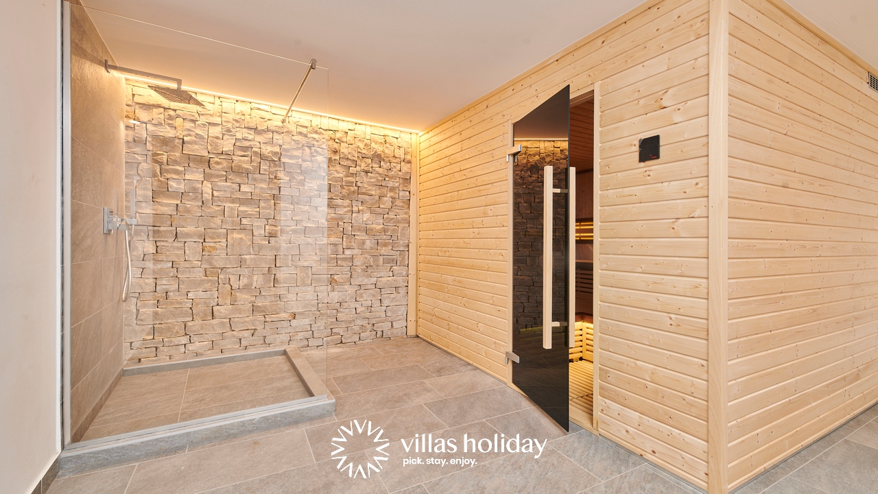 The glass doors are the only thing separating you from the lovely garden of the villa, where you also have a large private pool with sun loungers at your disposal. Enjoy morning coffees on the terrace overlooking the island’s panorama, or spend a pleasant afternoon preparing delicious barbecue meals. The real surprise of the villa is the sauna where you will surely spend relaxing moments.